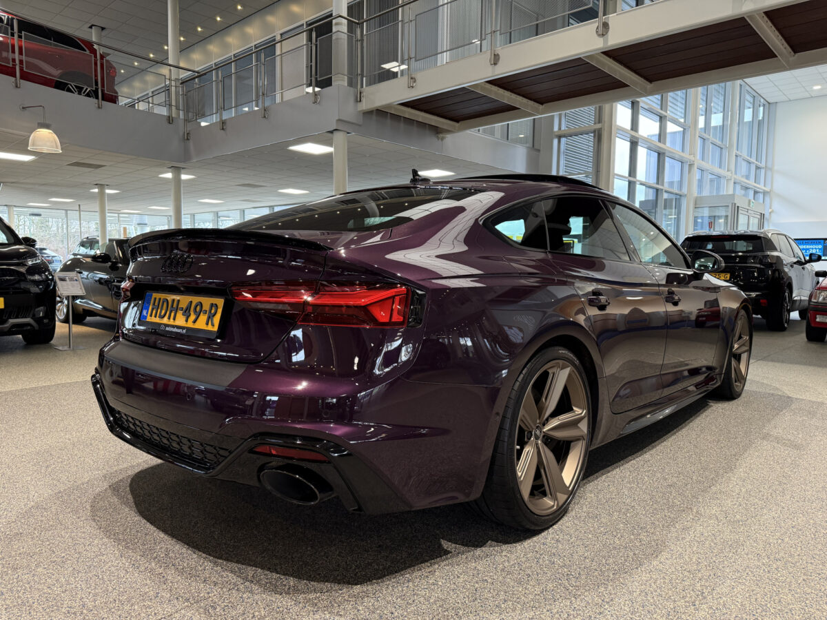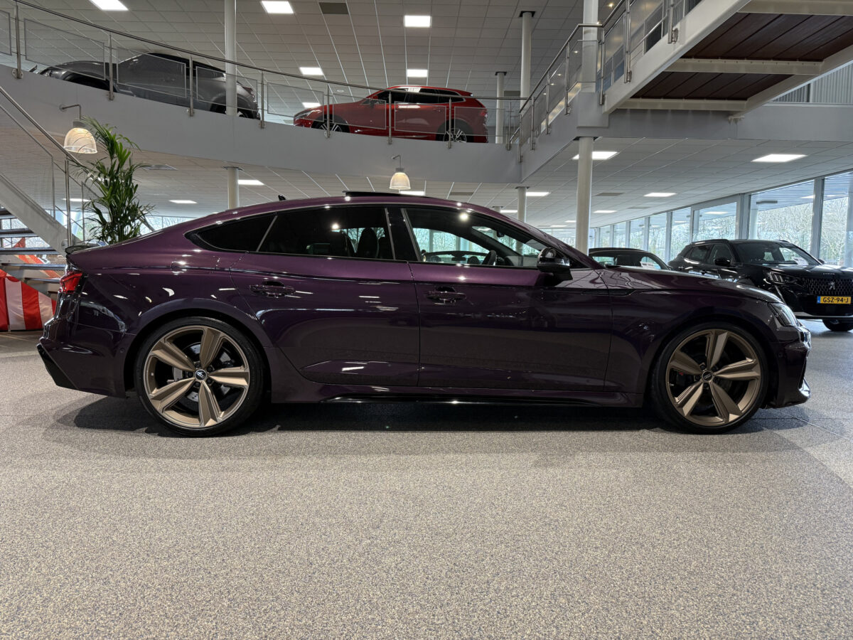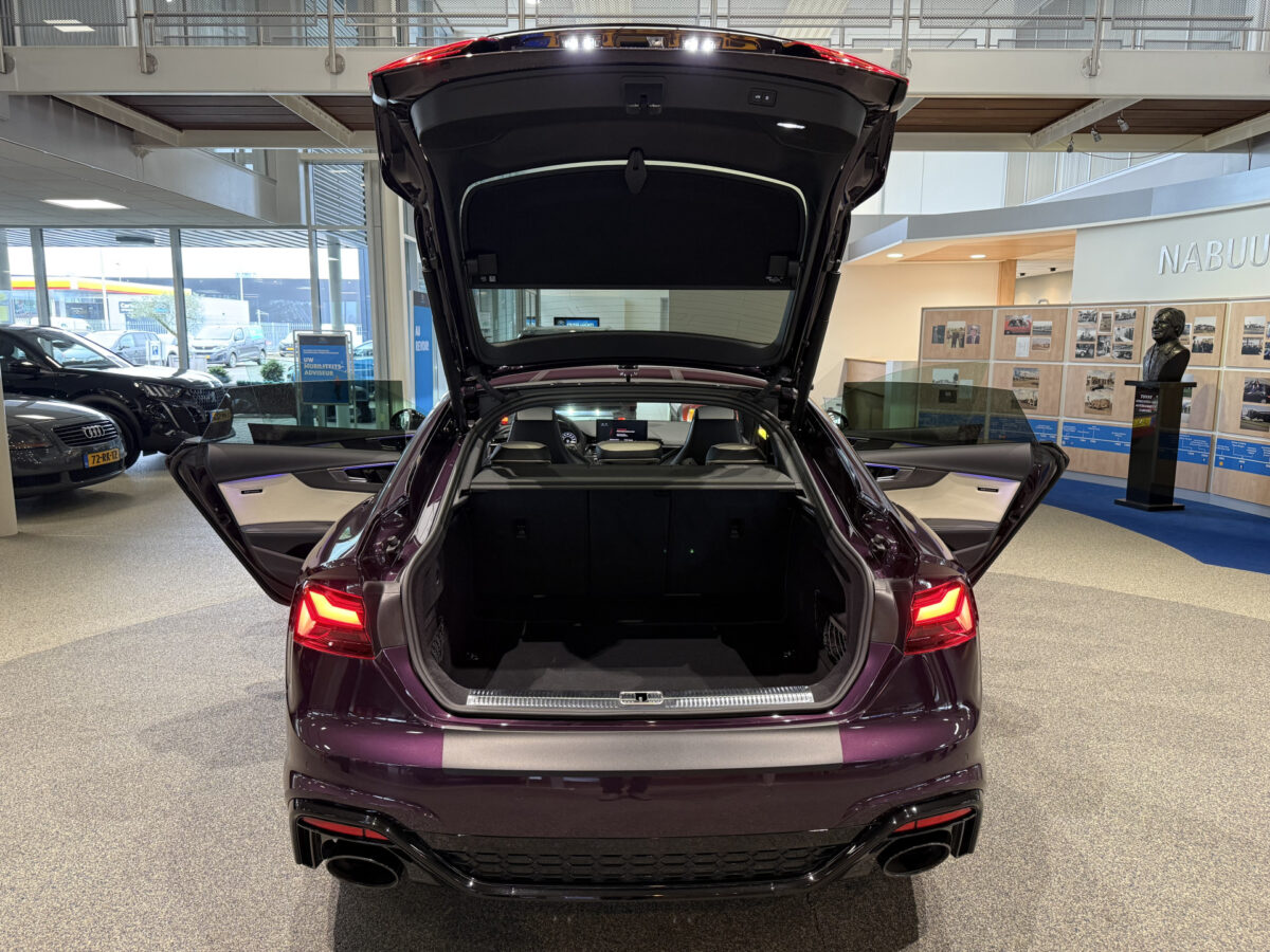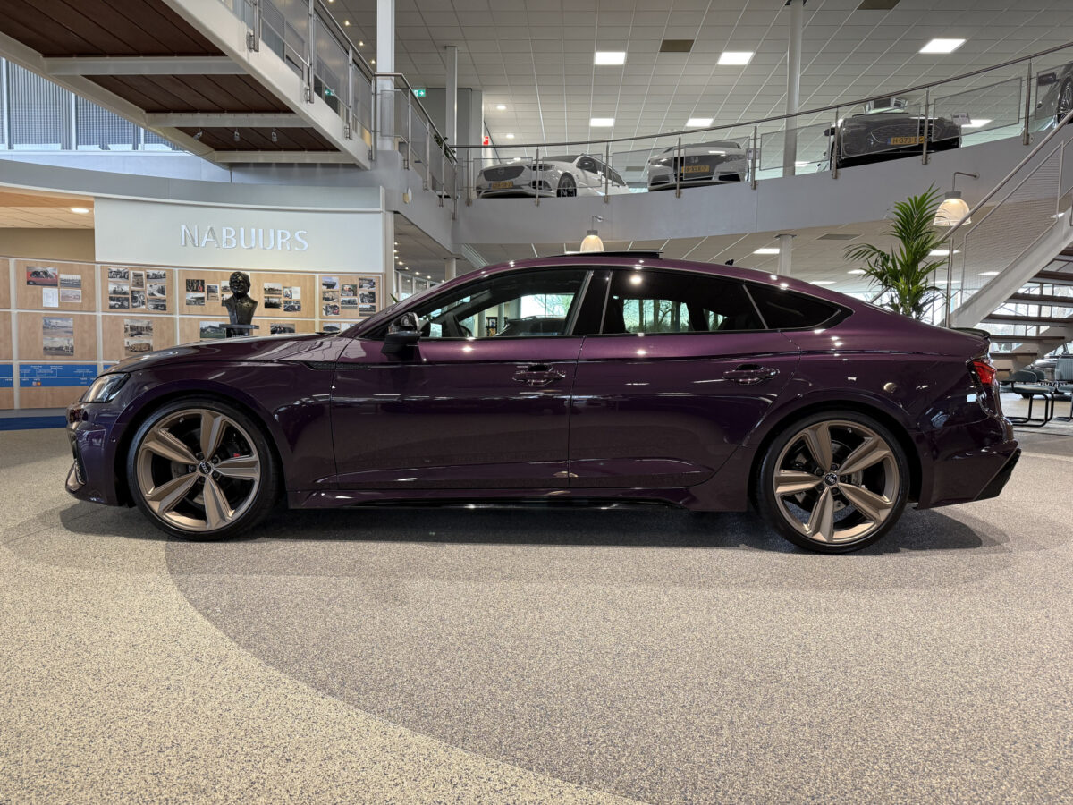 Deze Audi RS5 Sportback 2.9 TFSI quattro Competition is voorzien van een unieke Audi Exclusive Kleur "Merlin Purple Metallic" (LZ3W), een volledig Audi Exclusive interieur en 20” Audi Exclusive velgen.